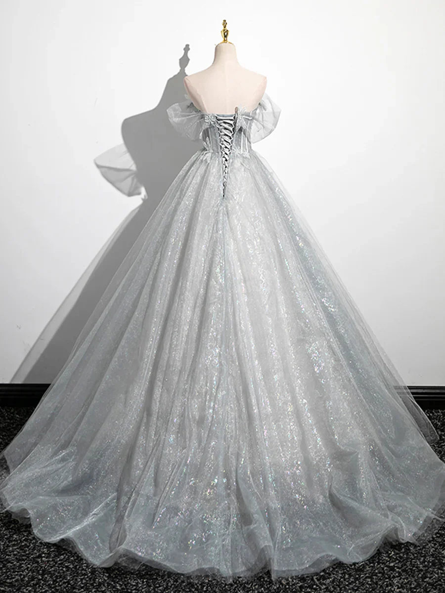 A-Line Off the Shoulder Sparkly Prom Dress, Gray Tulle Corset Floor Length Evening Dress HZ1024