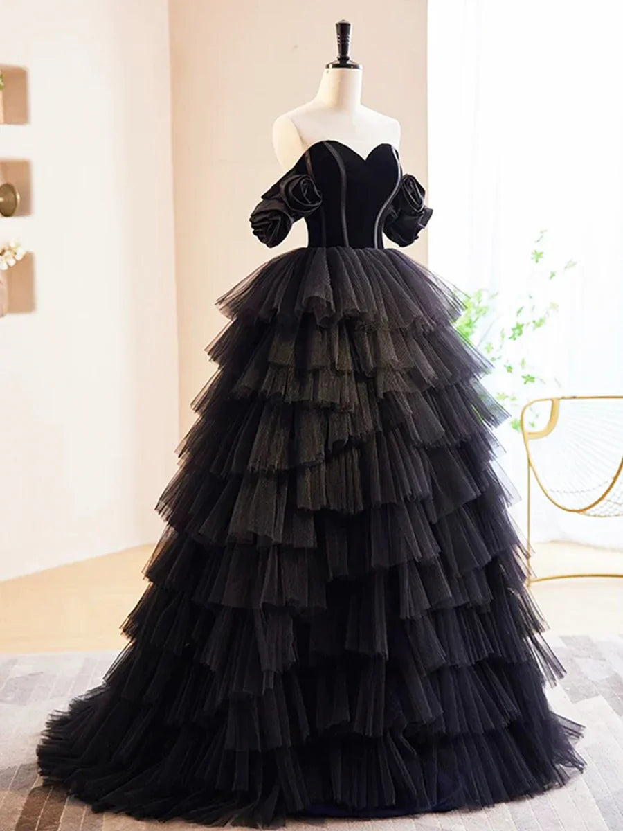 Black Velvet and Tulle Long Prom Dress, A-Line Off the Shoulder Formal Evening Dress HZ1024