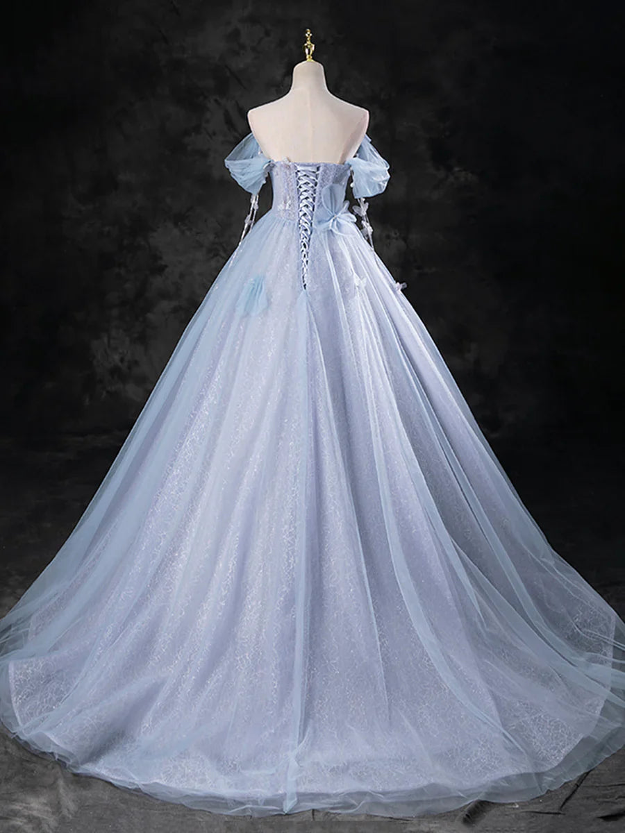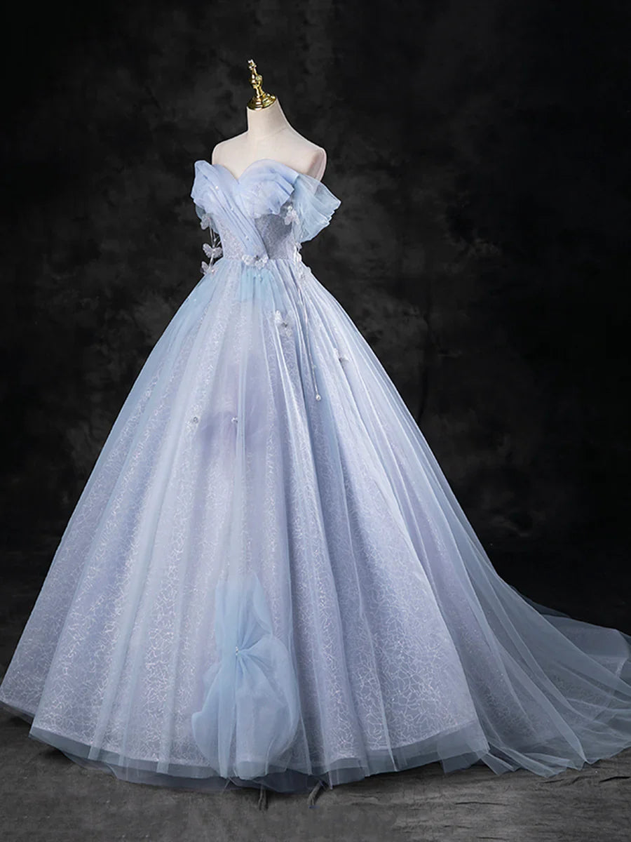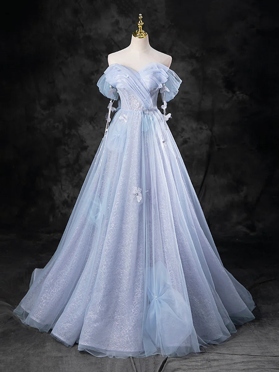 Blue Pearl Tulle Floor Length Prom Dress, A-Line Off the Shoulder Formal Party Dress HZ1024