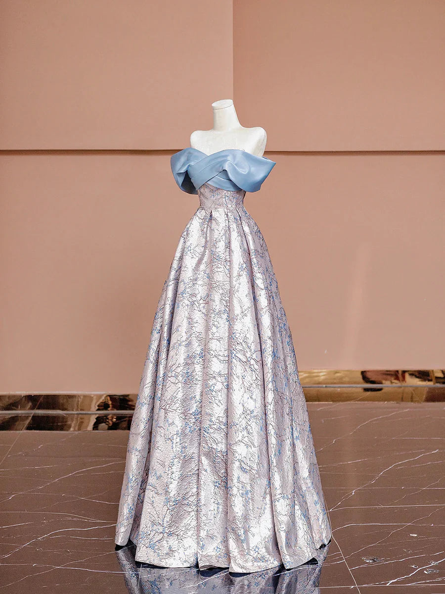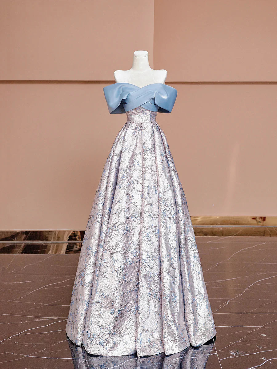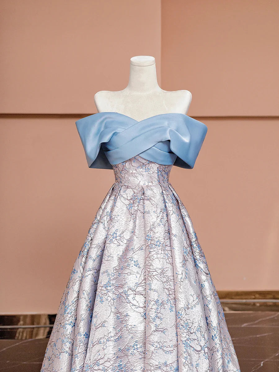 Blue Satin and Floral Pattern Floor Length Prom Dress, Off the Shoulder Evening Party Dress HZ1024