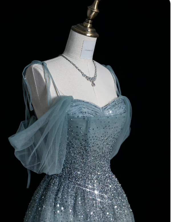 Blue Strapless Spaghetti Strap A Line Sequined Tulle Long Prom Dresses HZ1024