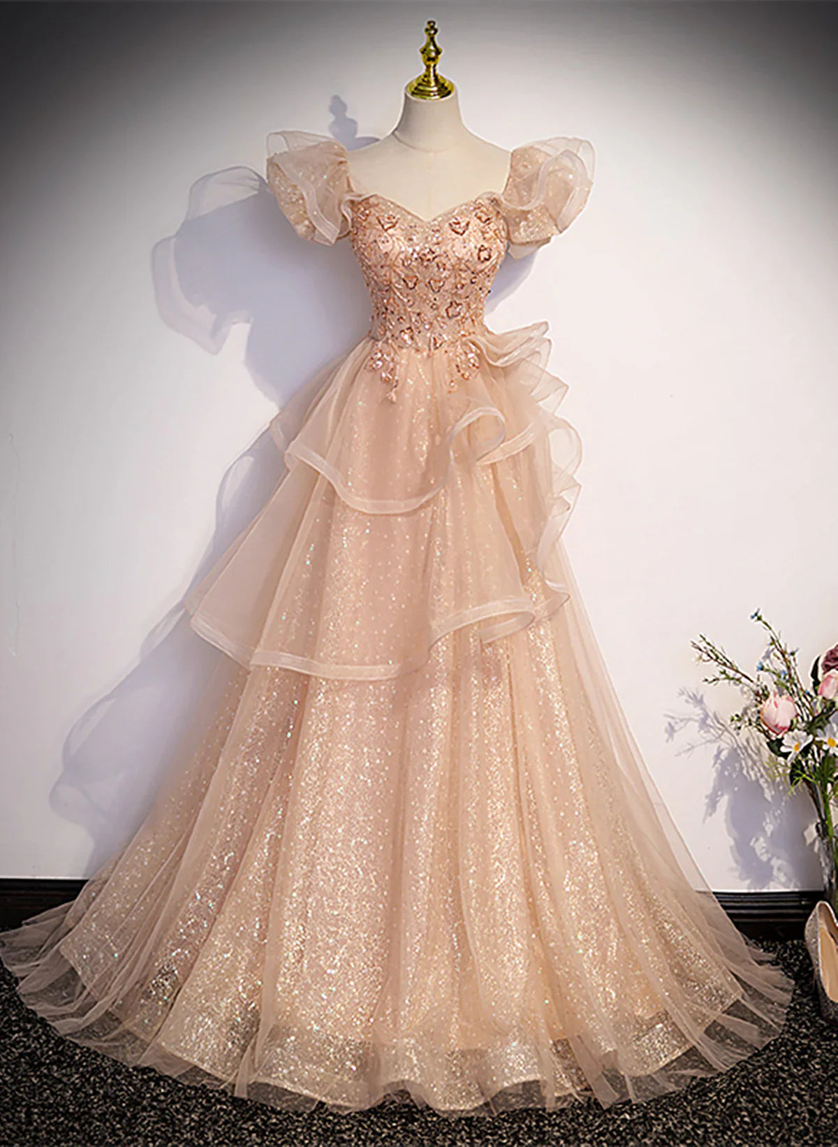 Cute A-line Shiny Tulle with Lace Off Shoulder Party Dress, Long Floor Length Prom Dress HZ1024