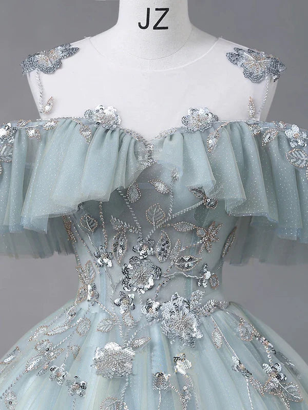 Glam Blue Tulle Sequins Lace Round Neckline Long Prom Dress, Blue Wedding Party Dress HZ1024