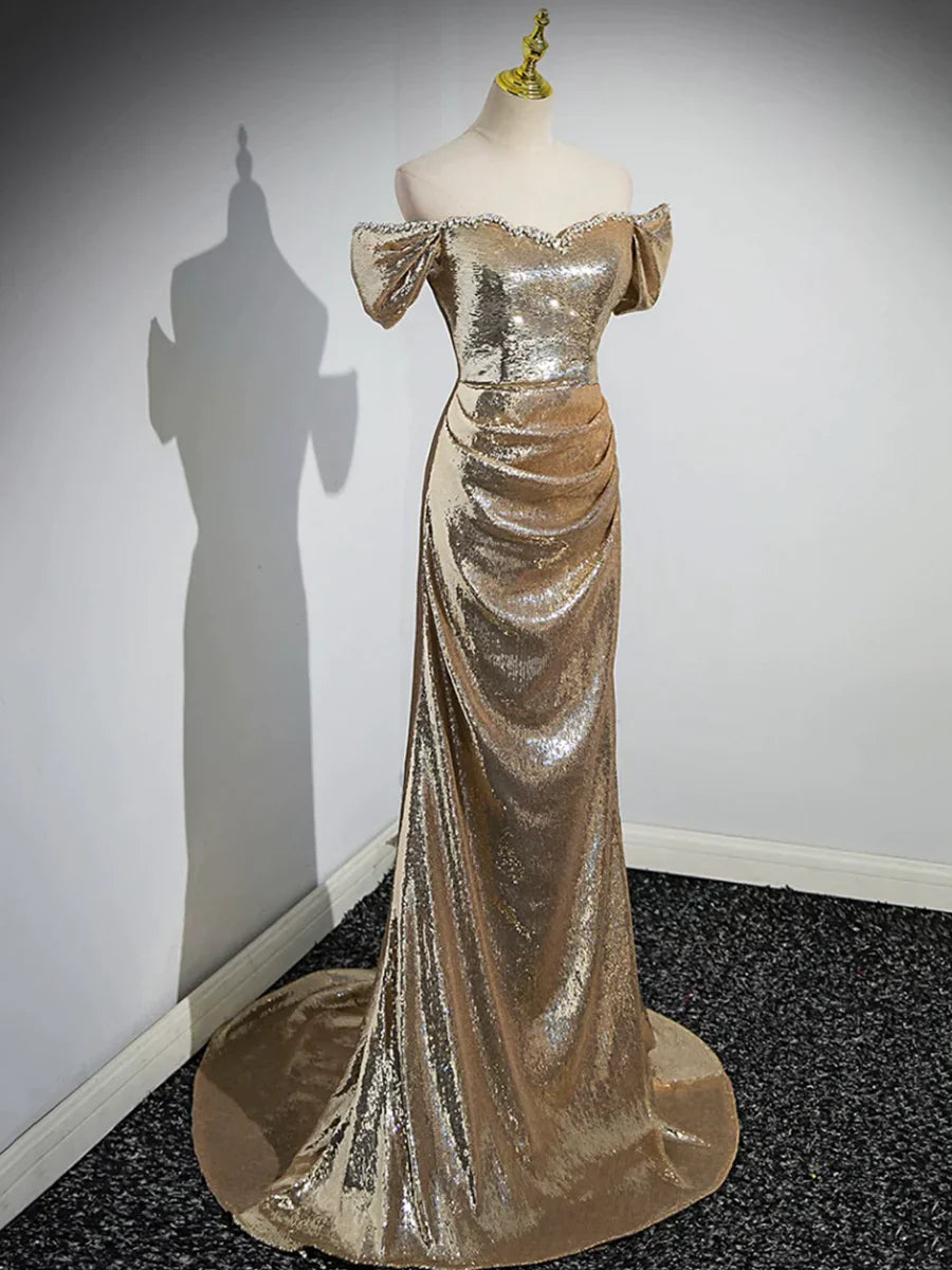 Gold Sequins Floor Length Prom Dress, Mermaid Off the Shoulder Evening Party Dress HZ1024