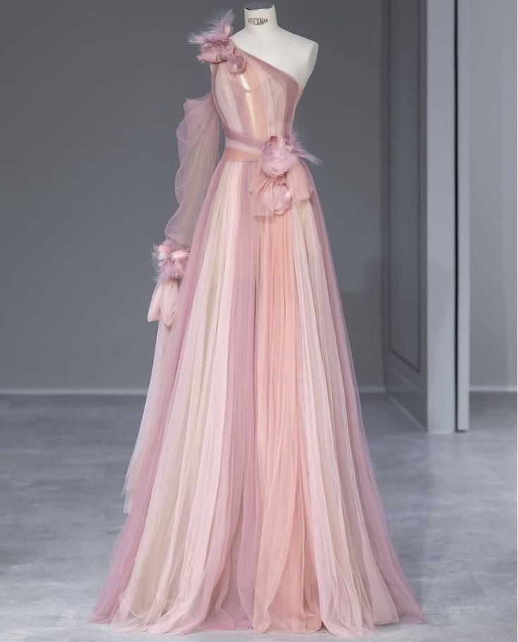 Gradient Pink Special One Shoulder Tulle Long Evening Gowns HZ1024