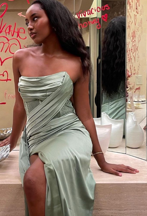 Green A-line satin high slit strapless ball gown evening dress HZ1024