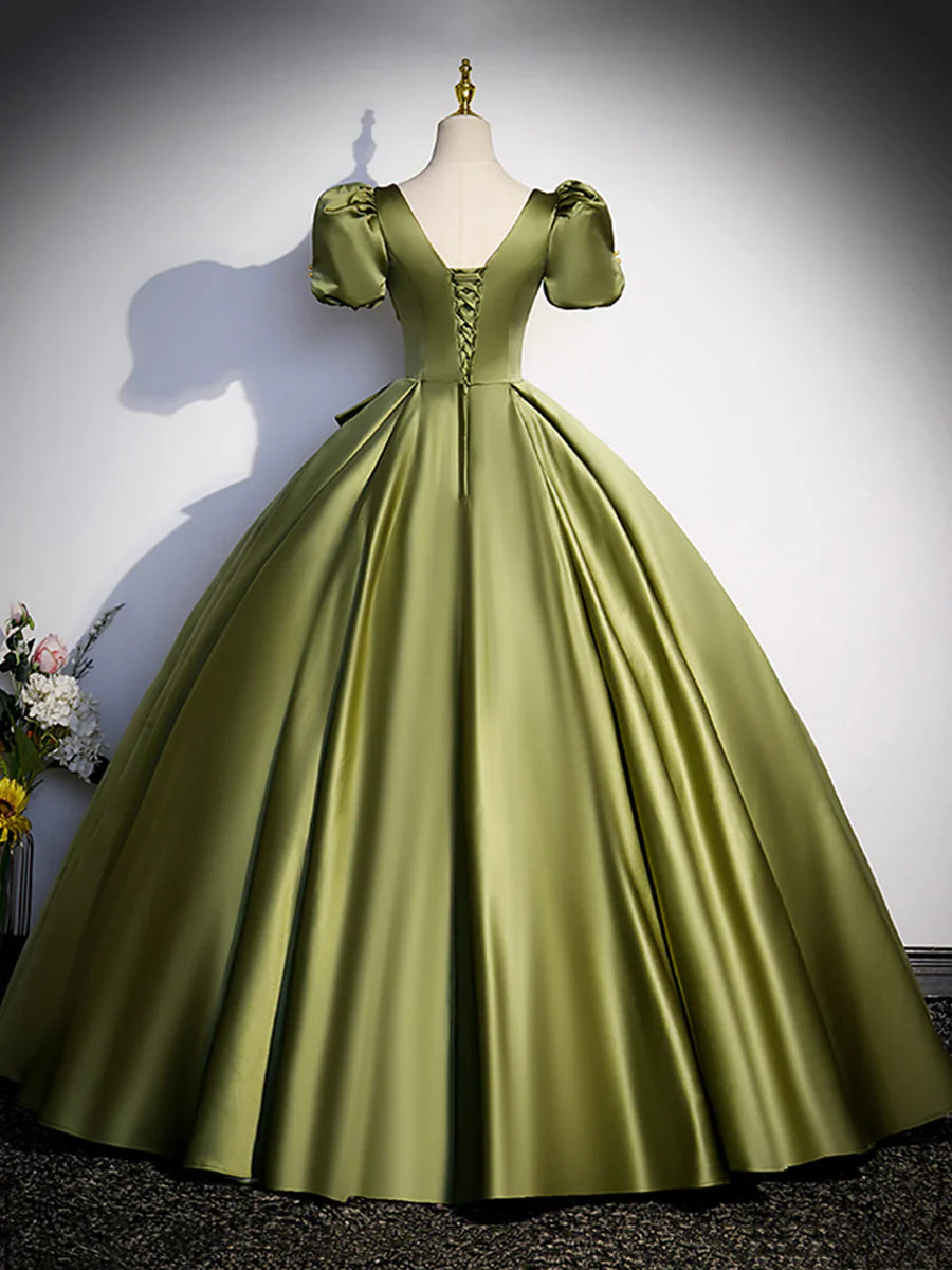 Green Satin Short Sleeve Floor Length Formal Dress, Green A-Line Prom Dress HZ1024
