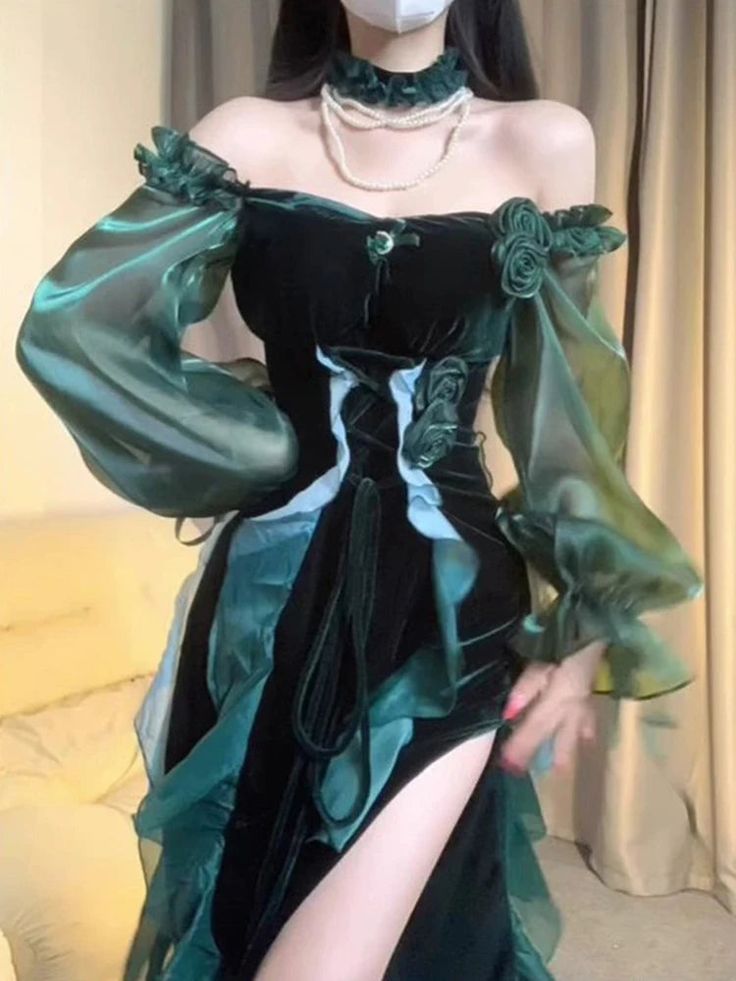 Green Strapless Velvet Ruffle Vintage Split Tea Break Dresses HZ1024
