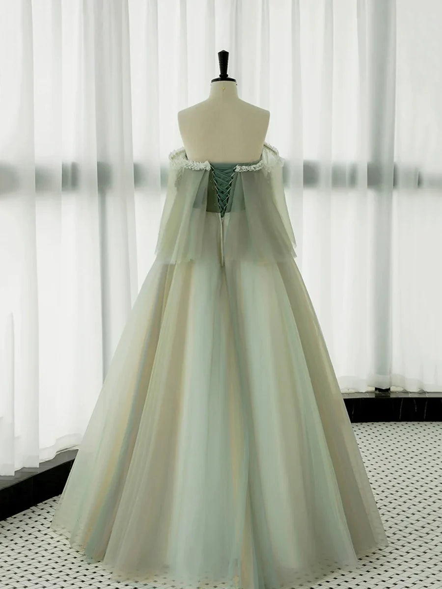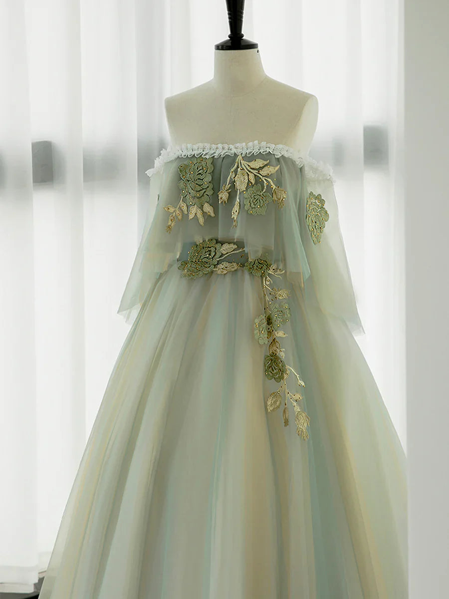 Green Tulle Lace Long Prom Dress, Green Off Shoulder Evening Party Dress HZ1024