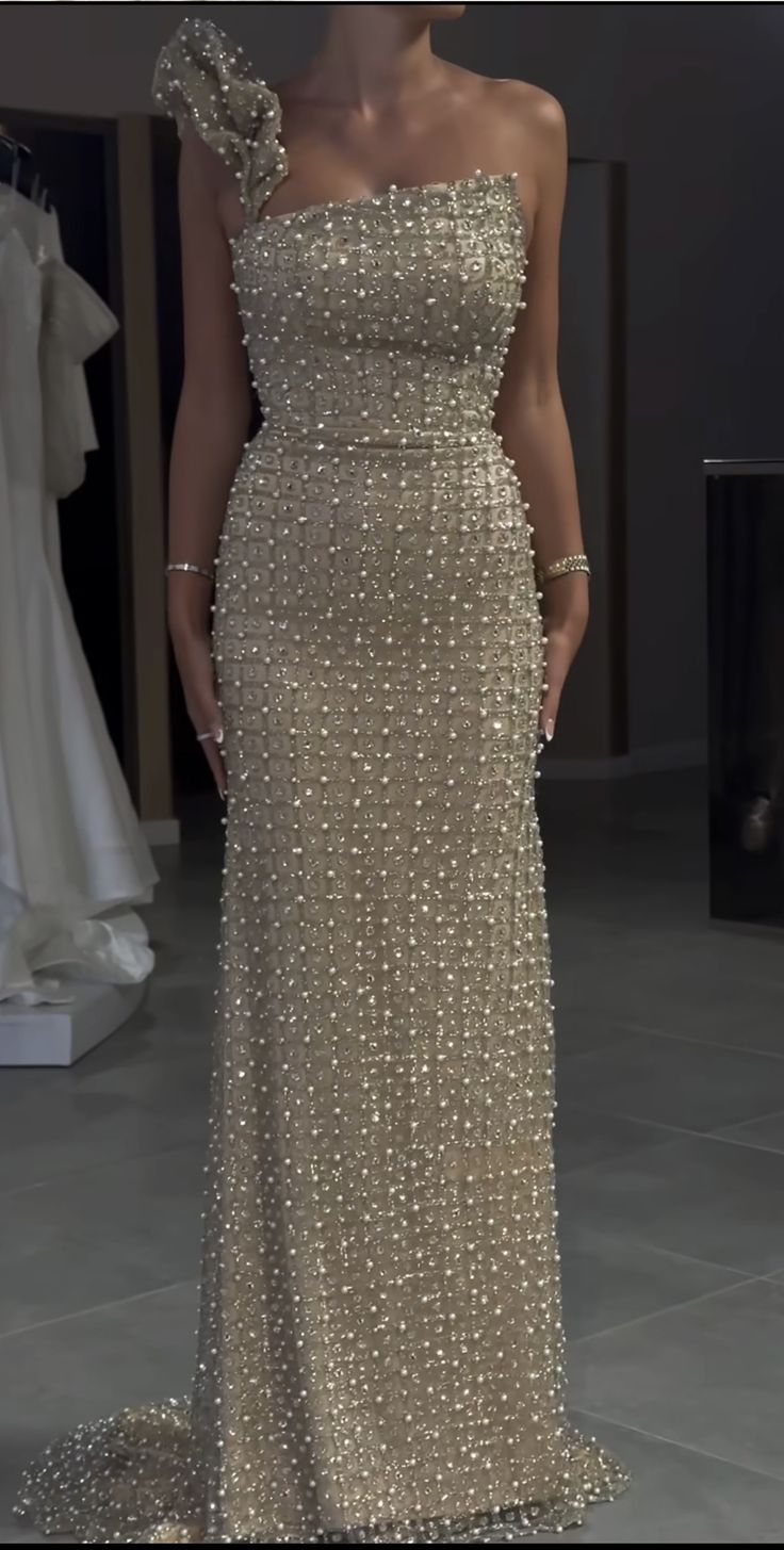 Ivory One Shoulder Pearl Bodycon Long Ball Gown HZ1024