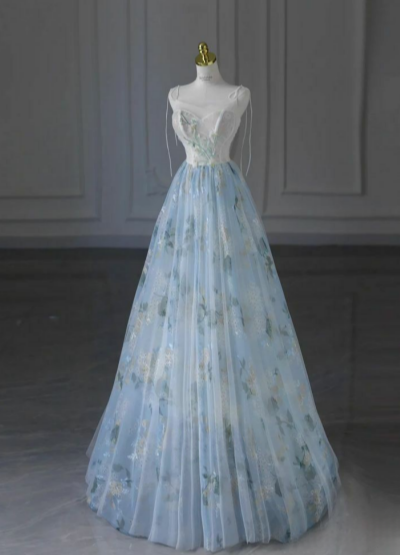 Light Blue A-Line Printed Spaghetti Strap Tulle Long Dress HZ1024