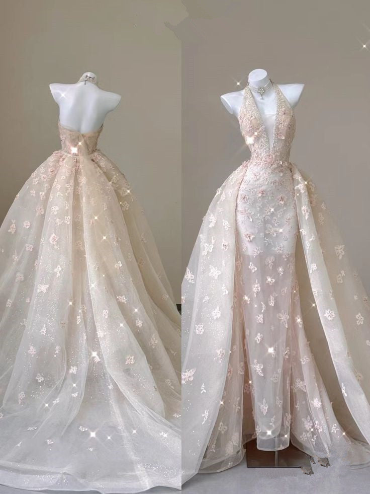 Light Pink Neckline V Neck 3D Printed Tulle Long Evening Dresses HZ1024