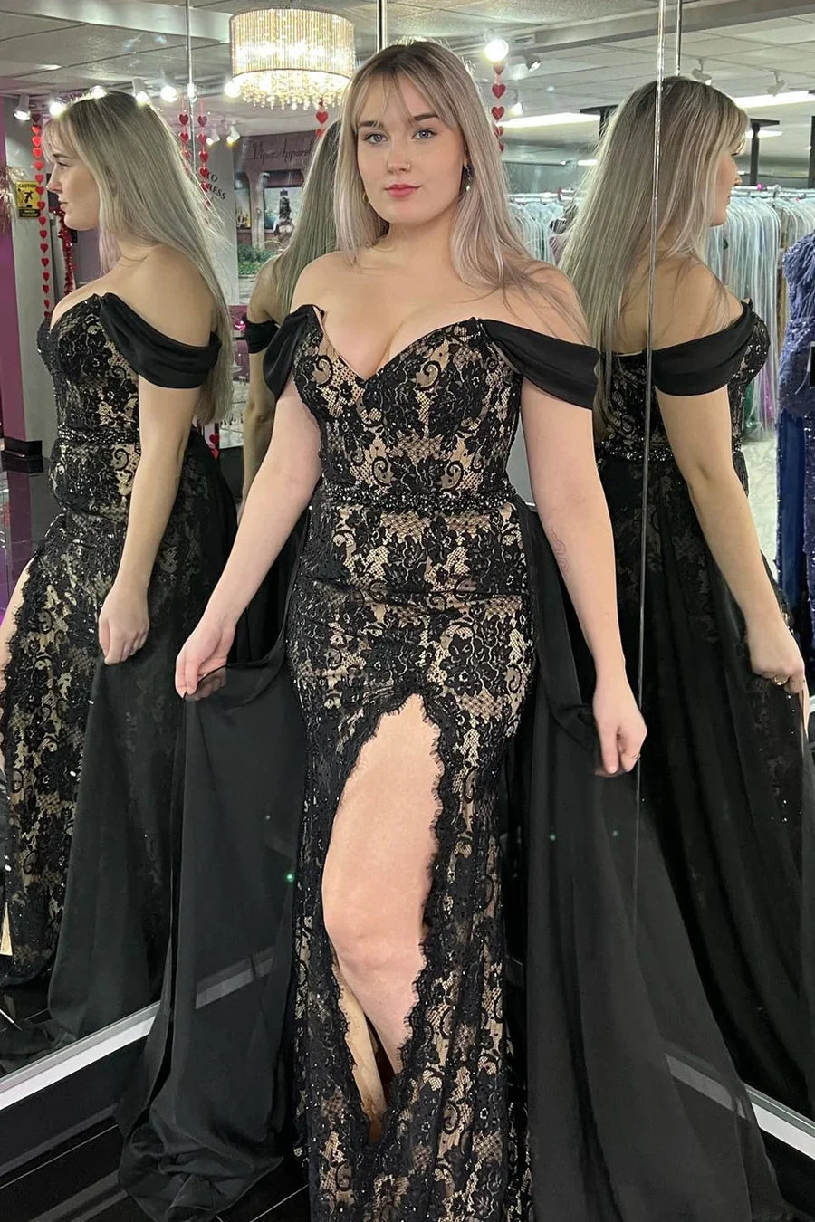 Mermaid Black Lace Off-the-Shoulder Long Prom Gown with Attached Train HZ1024