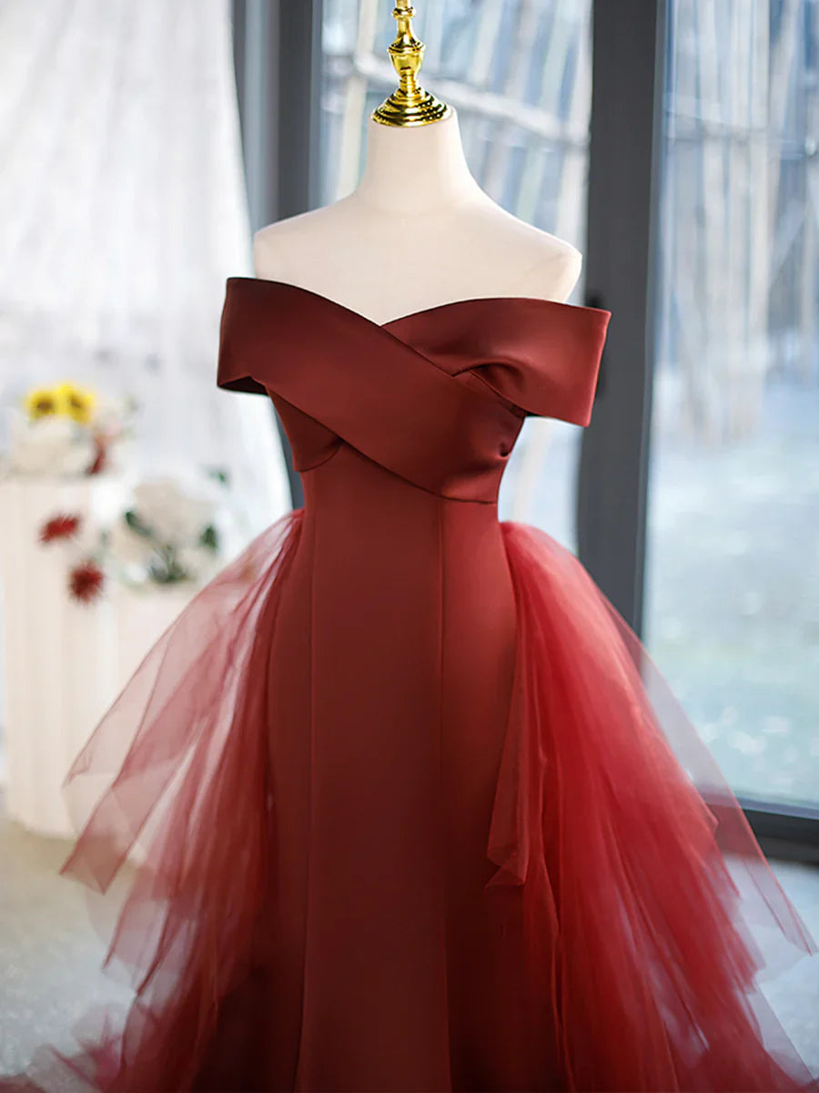 Mermaid V-Neck Satin Long Prom Dress, Burgundy Off Shoulder Evening Dress with Bow HZ1024