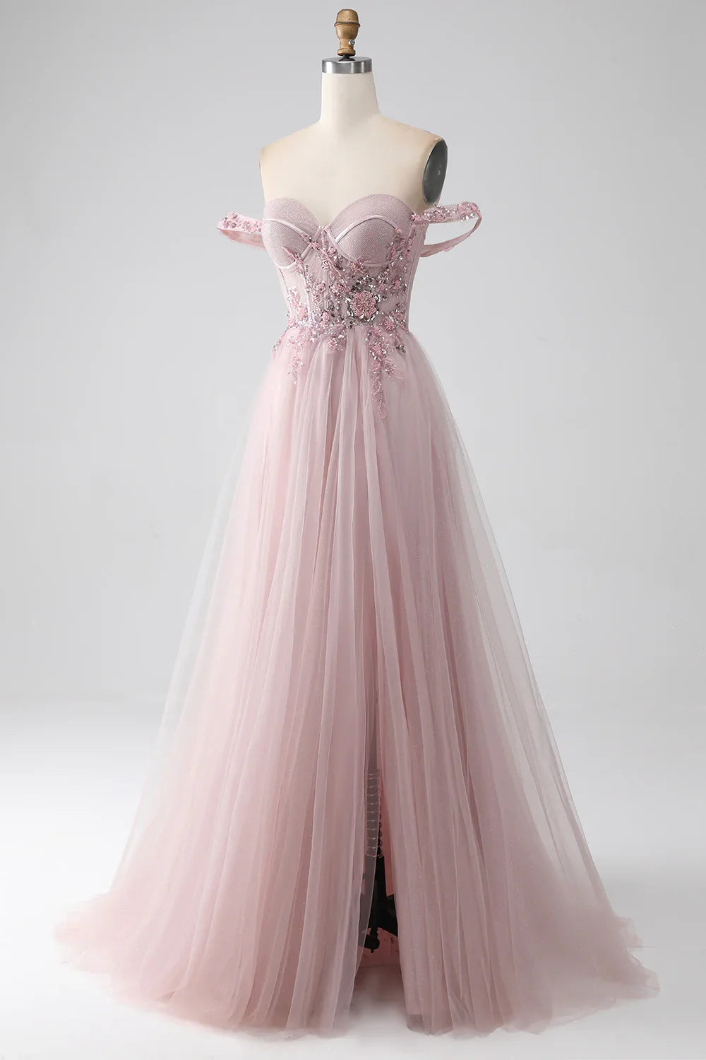 Off the Shoulder A Line Beaded Prom Dress with Slit HZ1024