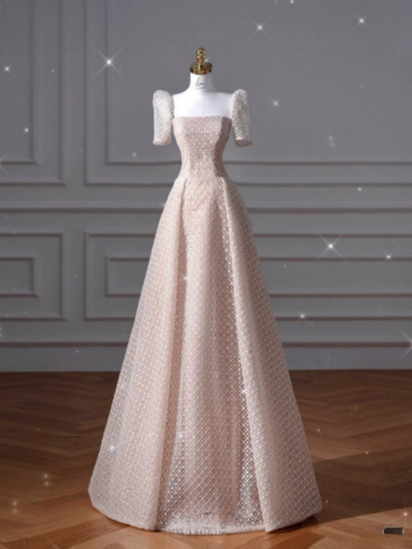 Pale Pink A-Line Square Neck Short Sleeve Tulle Long Prom Dresses HZ1024