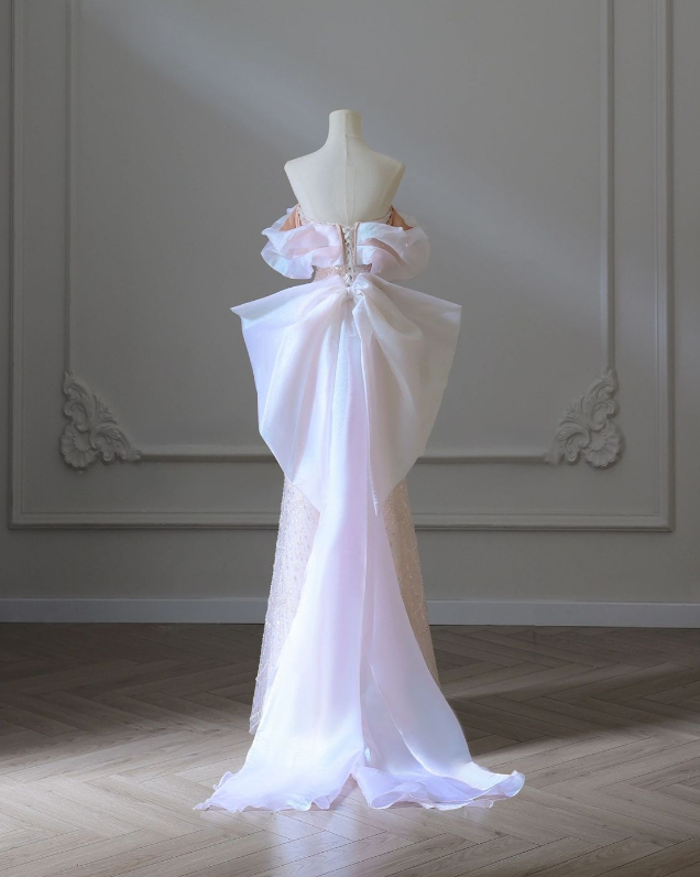 Pink A-Line Sheath Strapless Beaded Tulle Bow Long Prom Dresses HZ1024