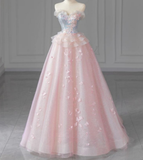 Pink A-Line Strapless Heart Neck Butterfly Tulle Long Prom Dresses HZ1024