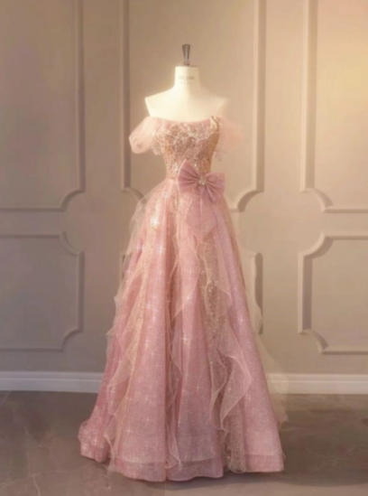 Pink A-Line Strapless Strapless Ruffle Bow Tulle Long Prom Dresses HZ1024