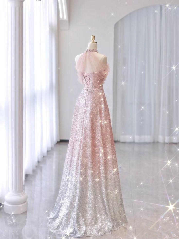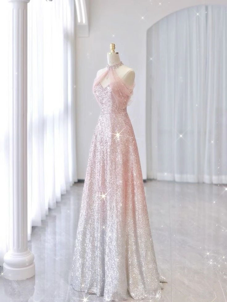 Pink Gradient Neck Hanging Sleeveless Full Shiny Beaded A-Line Long Evening Dress HZ1024