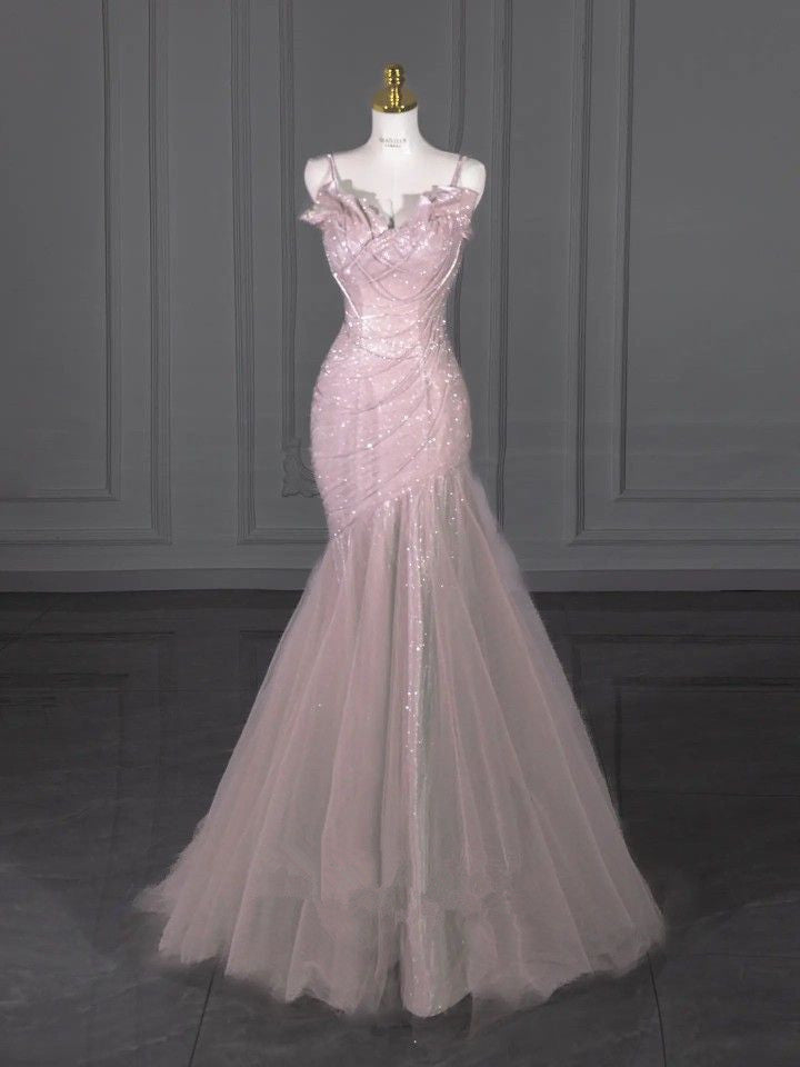 Pink Mermaid Spaghetti Strap Heart Neck Glitter Tulle Long Evening Dresses HZ1024