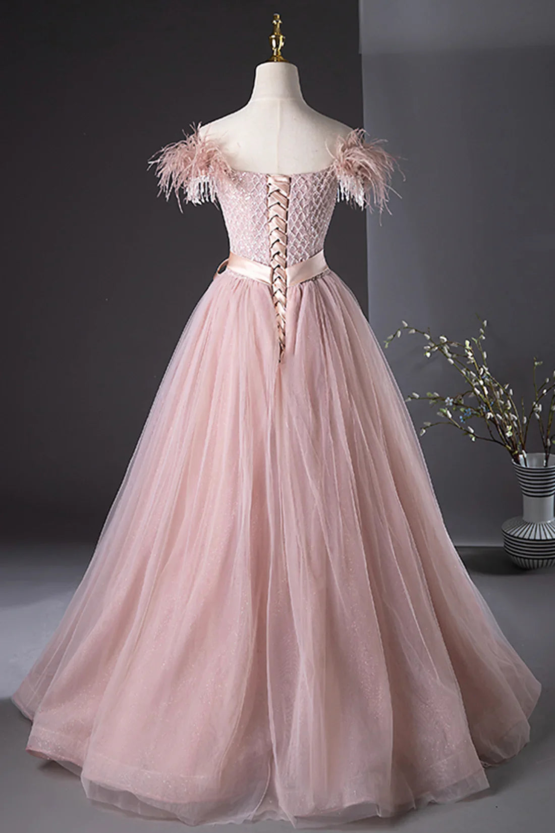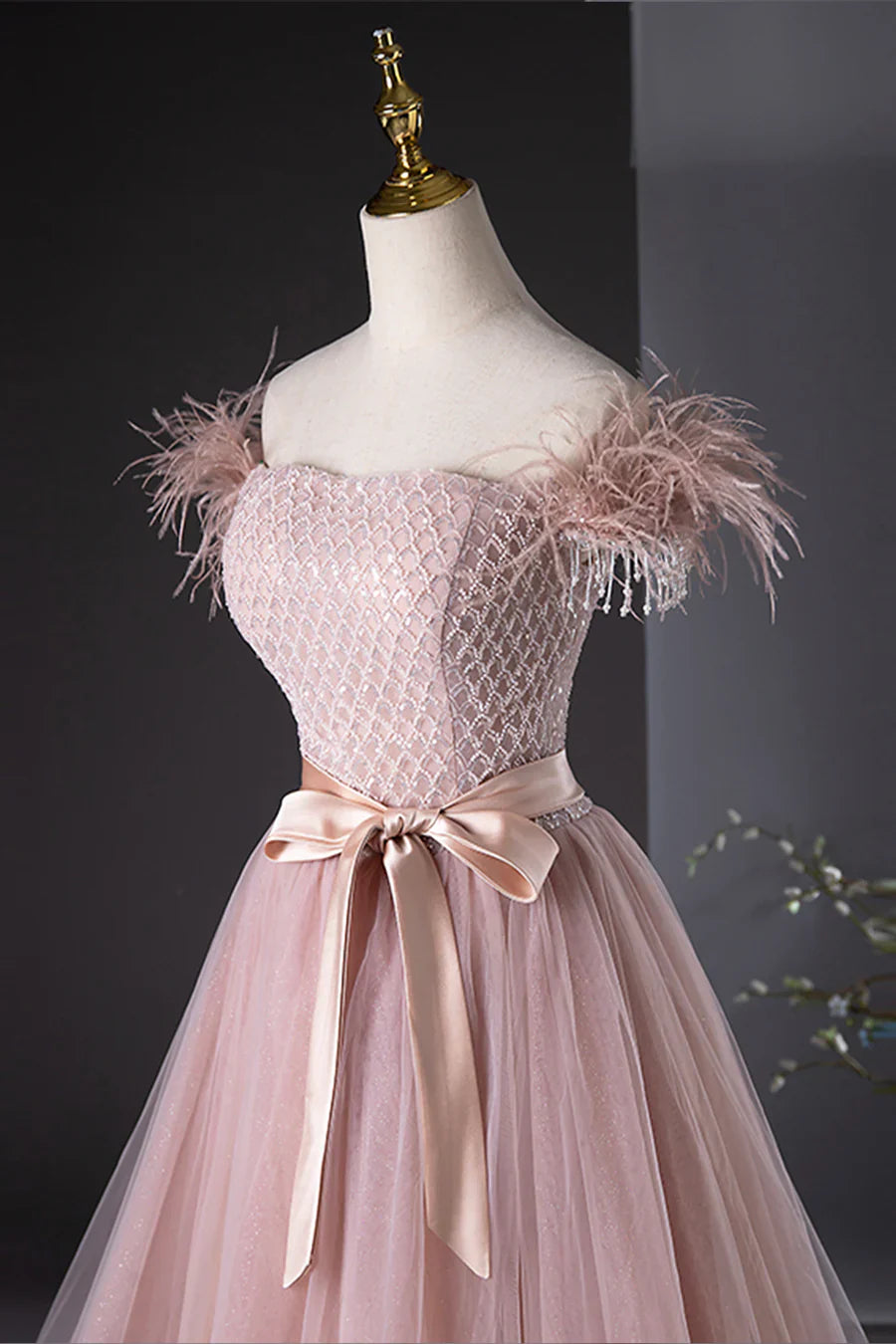 Pink Tulle Beaded Long Prom Dress, Lovely Pink Off the Shoulder Evening Party Dress HZ1024