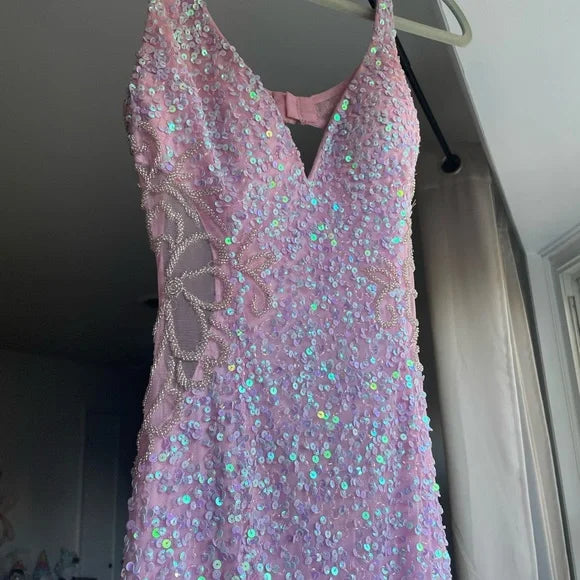 Pink V Neck Straps Sequins Cutout Split Long Prom Dresses HZ1024