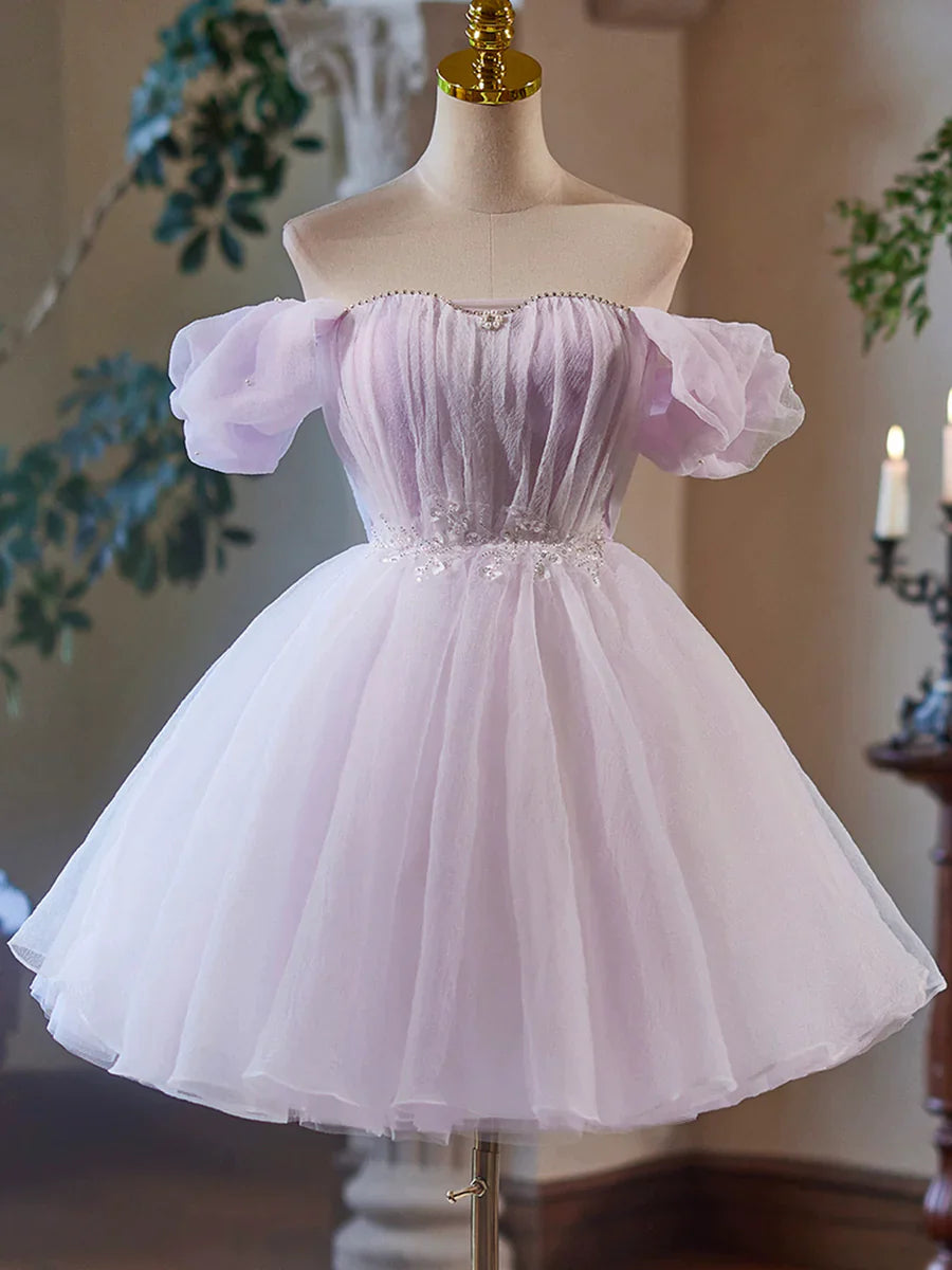 Purple Tulle Short A-Line Party Dress, Lovely Off the Shoulder Evening Dress HZ1024