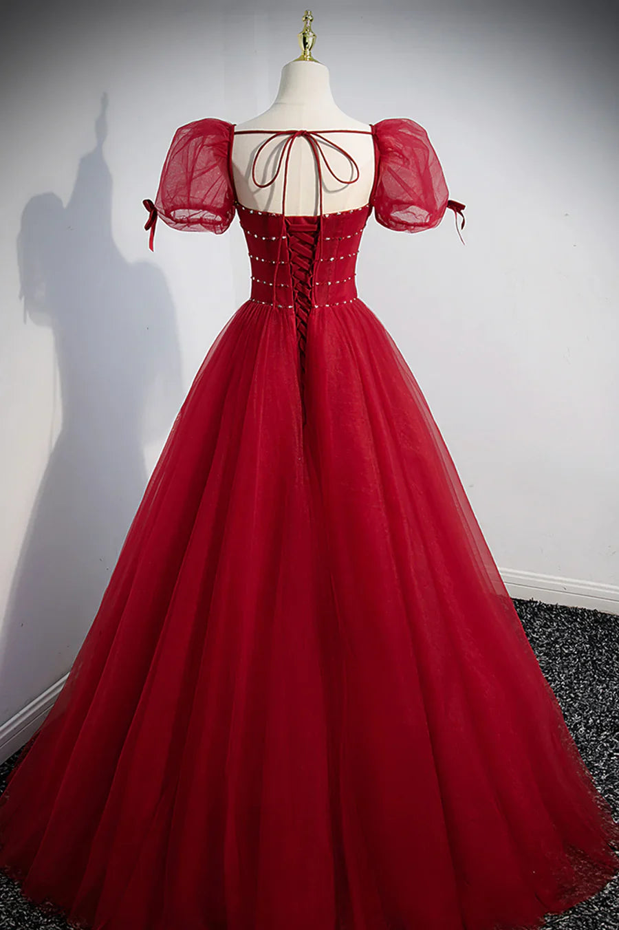 Red Beaded Tulle A-Line Long Formal Dress, Red Prom Dress HZ1024