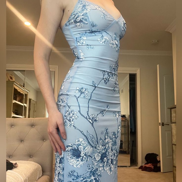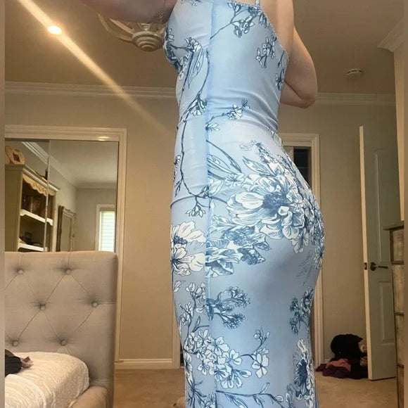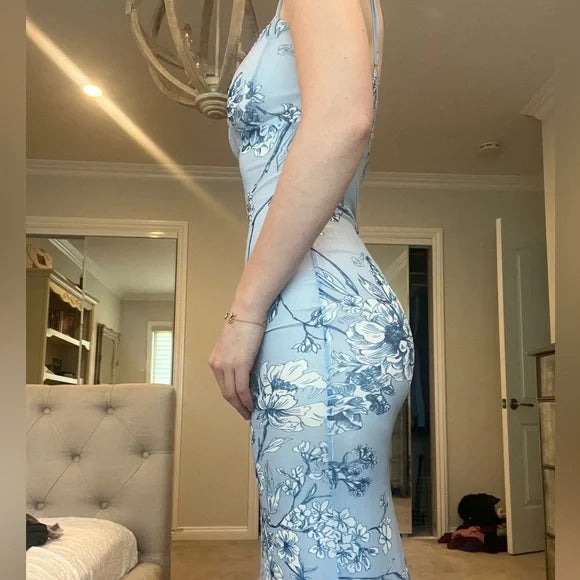 Sexy Blue Mermaid Printed Spaghetti Strap Long Prom Dresses HZ1024