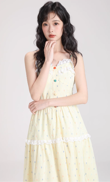 Simple Fashion Light Yellow Floral Design Spaghetti Strap Dress HZ1024