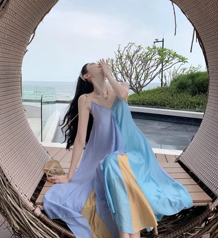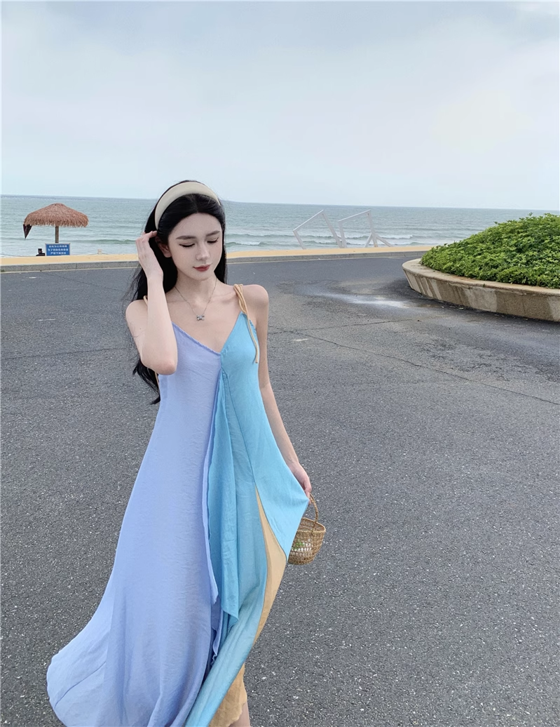 Simple Multi-color Splicing Design A-Line Casual V-neck Spaghetti Strap Dress HZ1024