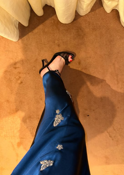 Soft Navy Short Sleeve Satin Ankle Length Ball Gown Evening Dress HZ1024