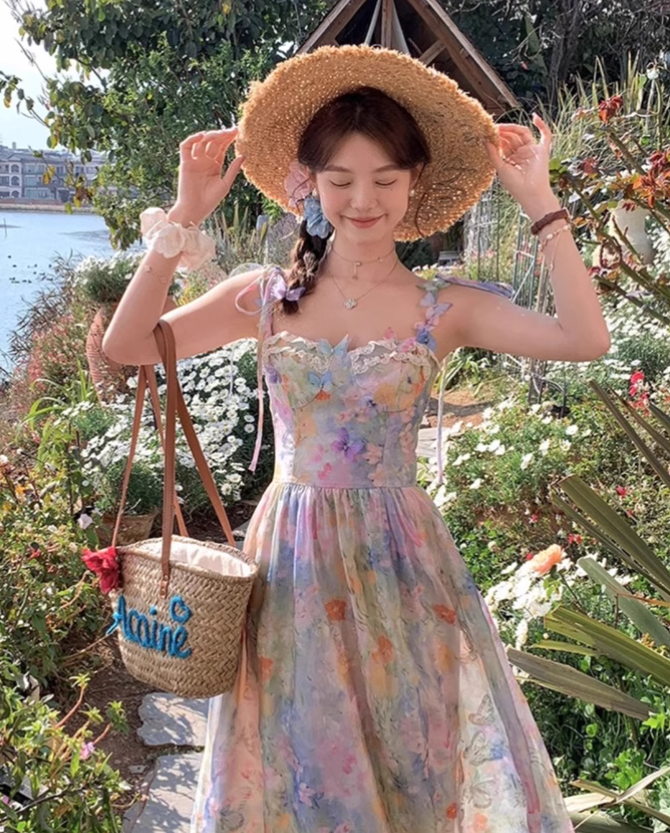 Vintage Fashion Floral Design Elegant Beach Holiday A-line Spaghetti Strap Dress HZ1024
