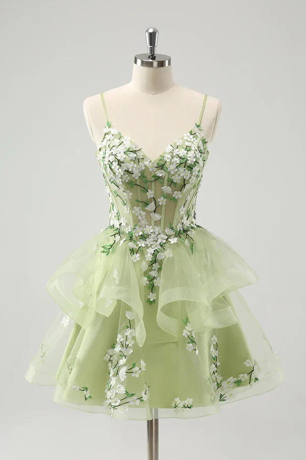 Vintage Mint Green Floral Embroidery Design A-line Spaghetti Strap Homecoming Dress HZ1024