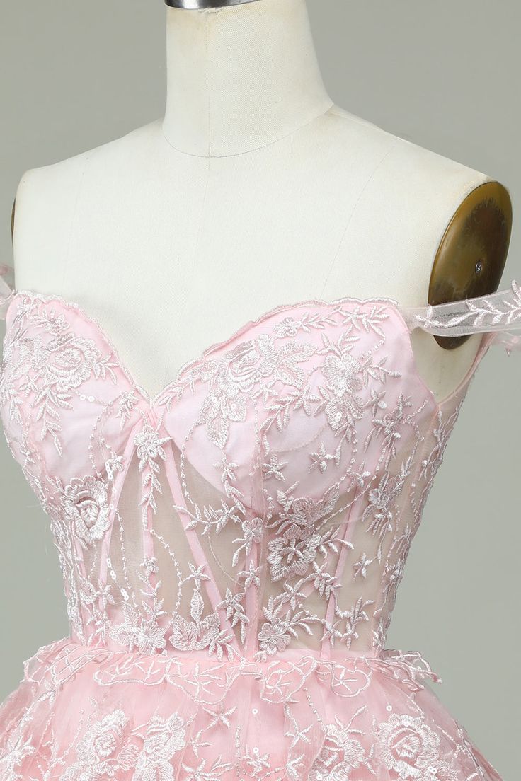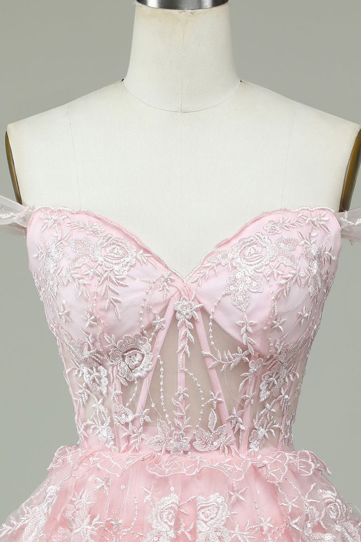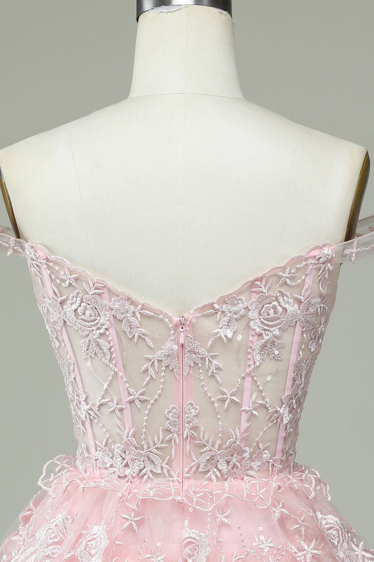 Vintage Pink Floral Embroidery Design A-line Off-the-shoulder Tiered Homecoming Dress HZ1024