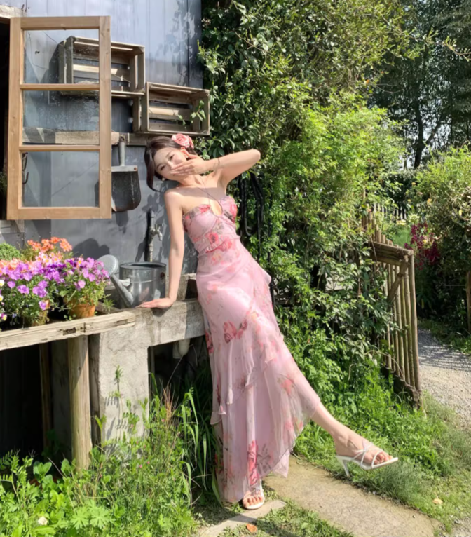 Vintage Pink Floral Irregular Hem Design Elegant Beach Holiday A-Line Sleeveless Halter Dress Summer Dress Party Dress HZ1024