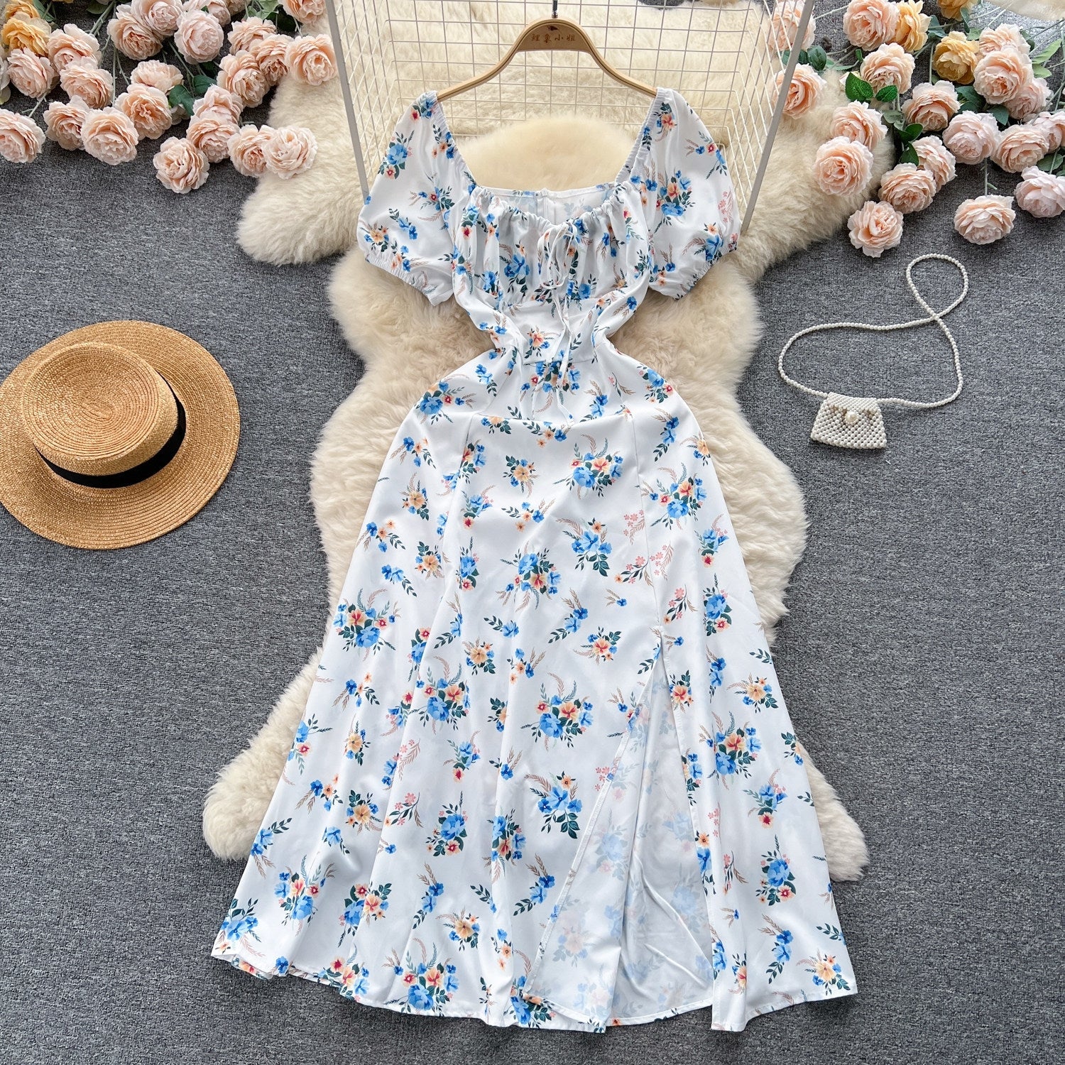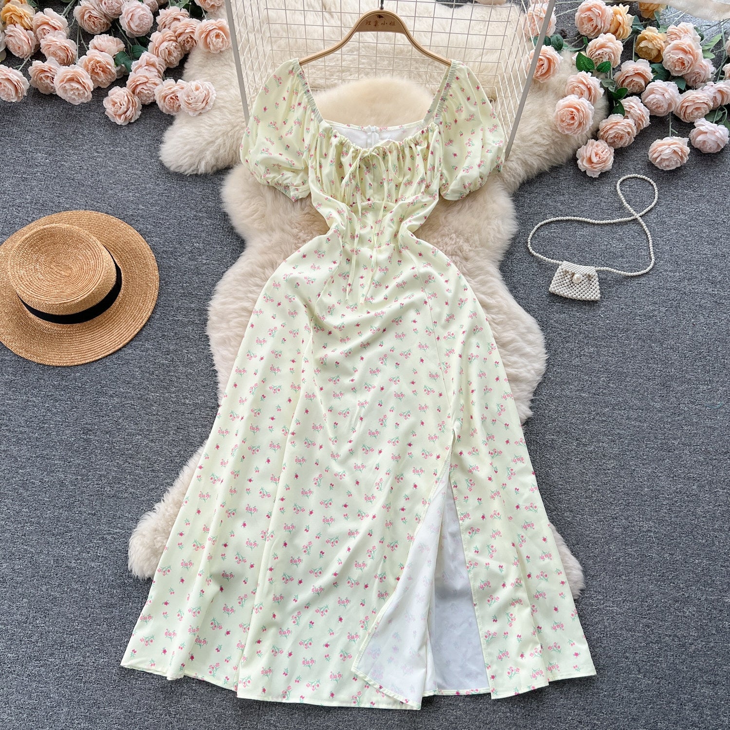 Vintage Simple Square Collar Puffed Sleeves Floral Dress HZ1024
