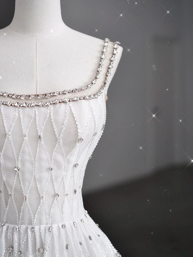 White A-line Spaghetti Straps Sleeveless Tulle Long Simple Evening Dresses HZ1024