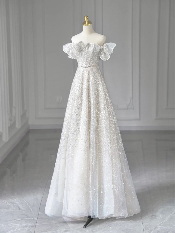 White A-line Strapless Beaded Tulle Formal Long Evening Dresses HZ1024