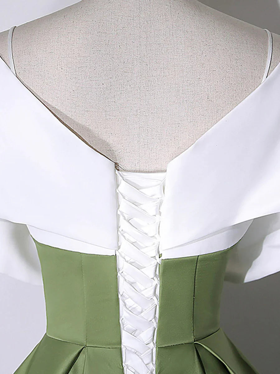 White+Green Satin Floor Length Prom Dress, V-Neck Off the Shoulder Evening Dress HZ1024