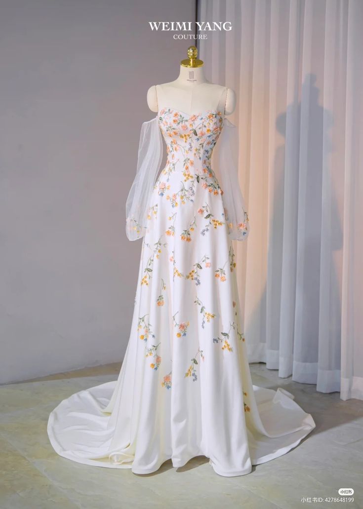White Strapless Long Sleeve Satin Printed Long Evening Gowns HZ1024