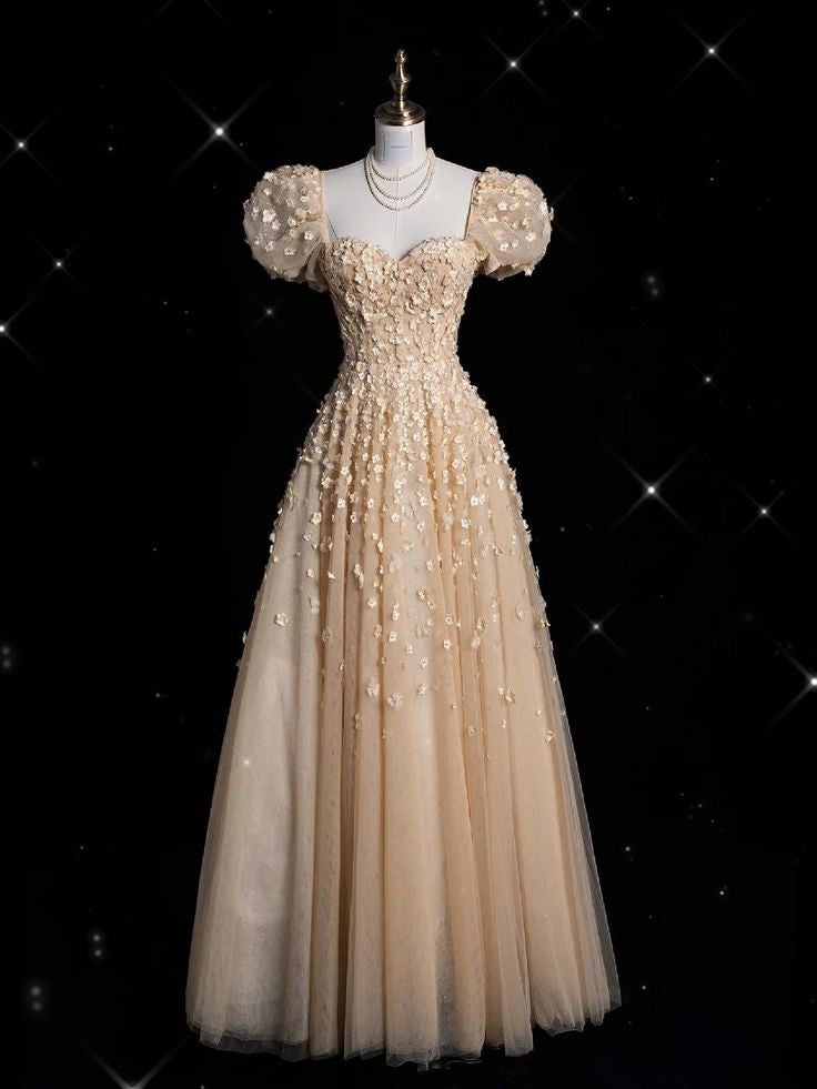 Yellow A-line Heart Shaped Neck Short Sleeve Tulle Long Evening Dress HZ1024